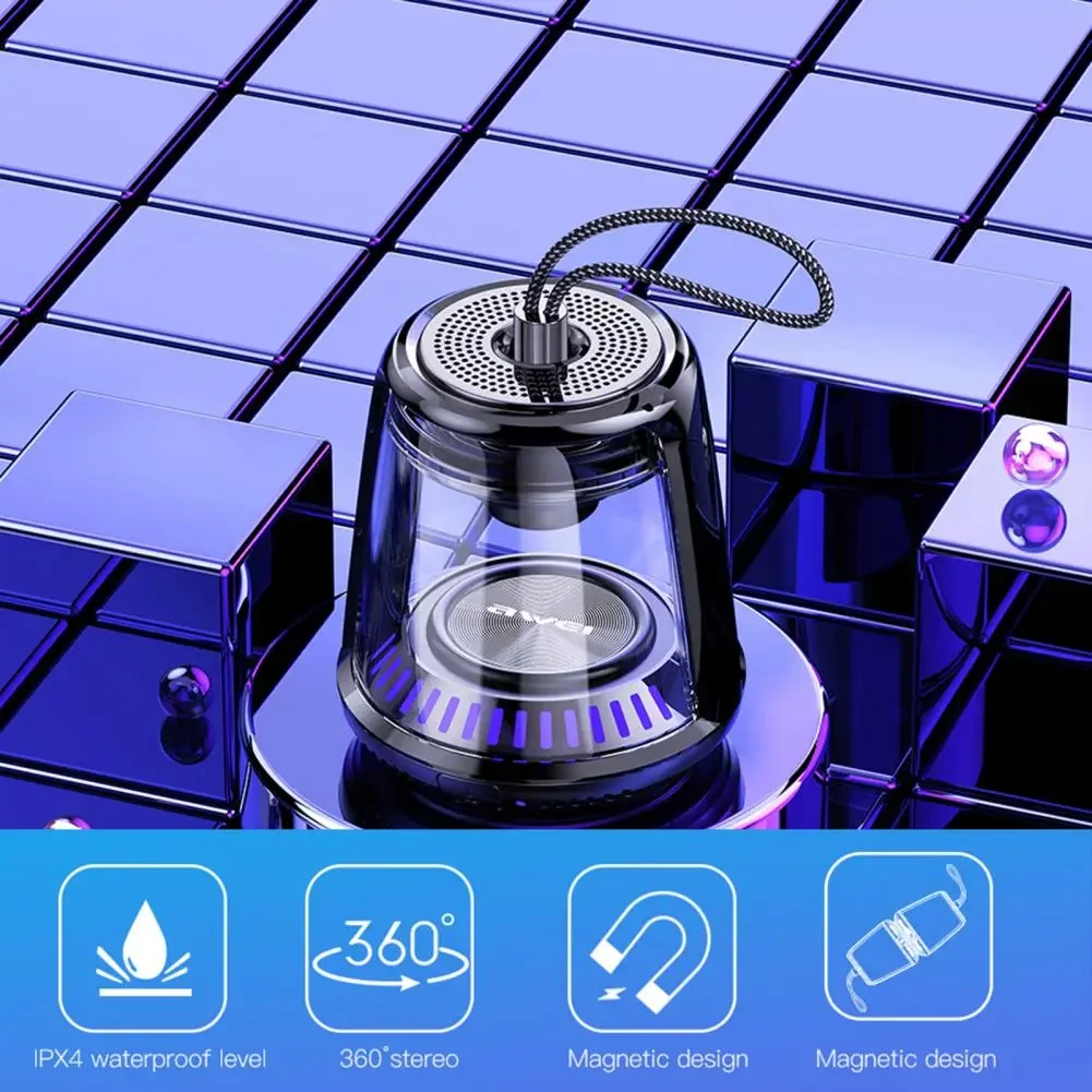 Bluetooth 5.0 ensures instant pairing, and has faster connection speeds, more stable signal transmission and lower power consumption. Built-in 800mAh battery and energy-saving circuit, the Bluetooth speaker can play for 6 hours after fully charged. 16 million lampwicks, the speaker has cool lighting effects.The speaker features IPX6 waterproof, magnetic base.