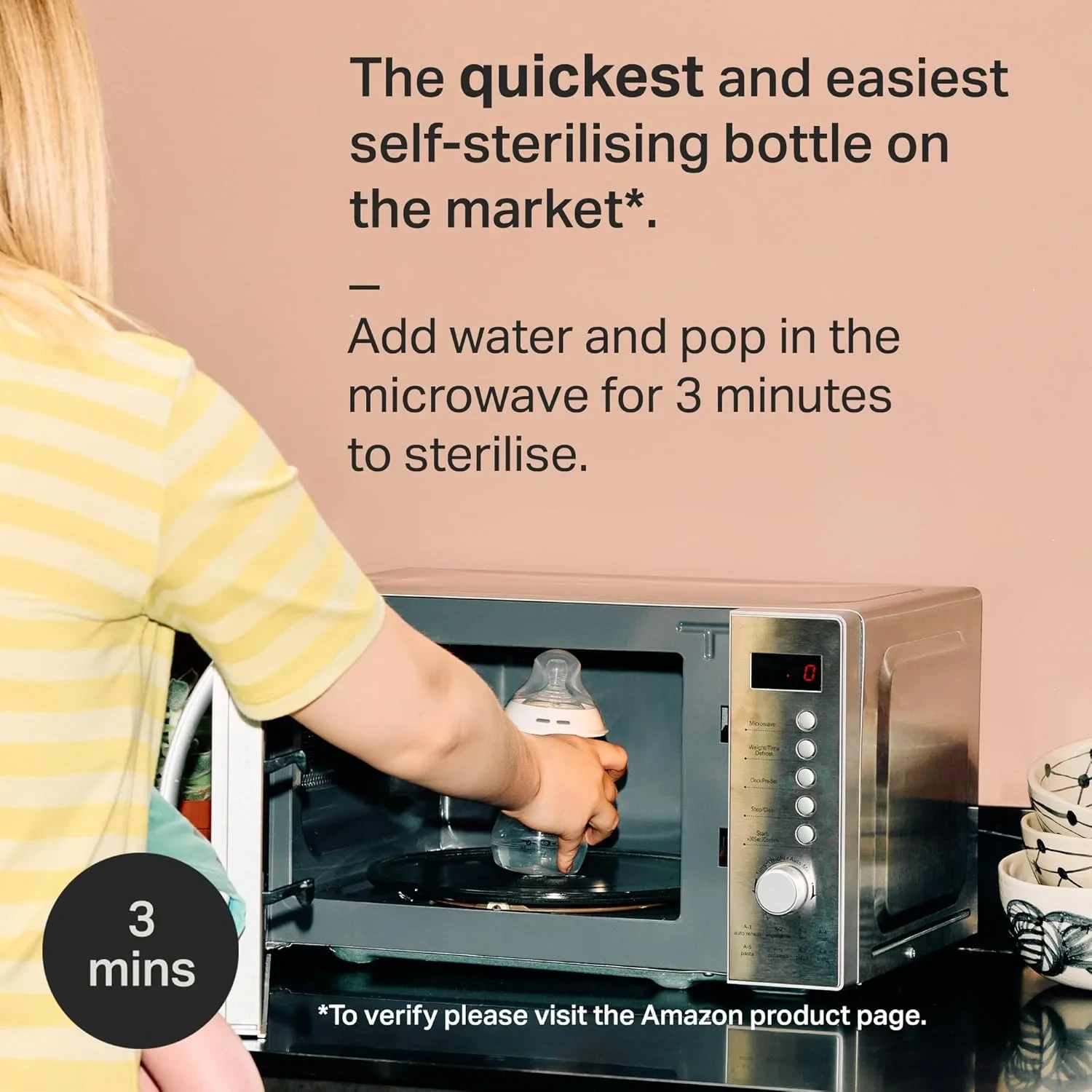 • New self-sterilising: Our baby bottles can now be self-sterilised, killing viruses and 99.9 Percent of bacteria***. Simply fill with 50ml of water, replace the teat and cap and heat in the microwave for 3 minutes