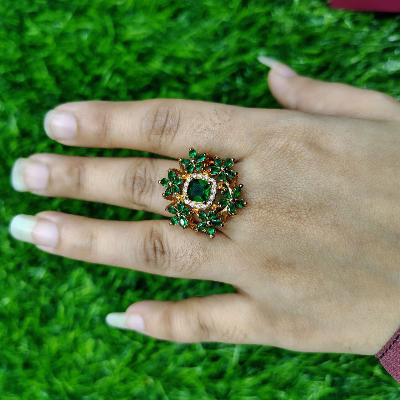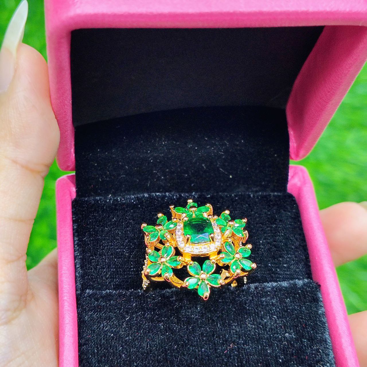 Bring elegance and luxury to your fingertips with the Emerald Blossom Luxury Ring. Featuring a grand floral design with sparkling green stones set in a rich golden frame, this ring is perfect for those who love bold, regal accessories. Ideal for weddings, parties, or festive events, it’s a true statement piece for any special occasion.
