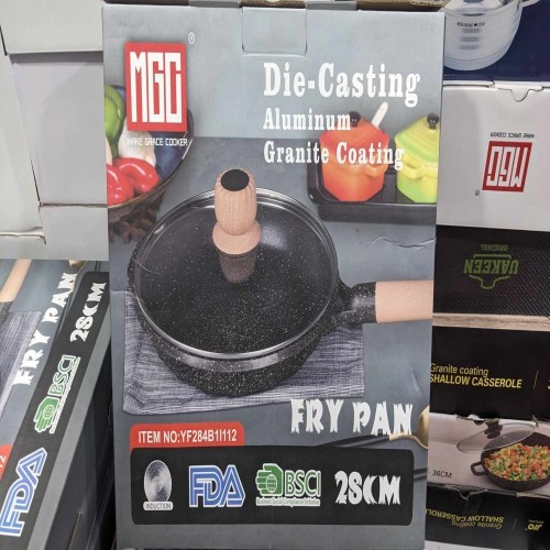 MGC Marble Granite Non-Stick Anti Scratch Frying Pan - With Lid 28 cm (Orginal Product) Material: die-cast aluminum With Wood Handle Coating: the intermediate coating and the outer coating are granite Knob: solid cylinder cover bead Cover: glass cover Handle: bevel bakelite handle (removable handle) Bottom: Induction bottom 1. Before first use, please tear up the label, then rinse thoroughly and wipe dry. 2. Should use the heat-resistant nylon, plastic or wooden spatulas for cooking in order to avoid the sharp or metal appliance that damages the surface of the nonstick pan.