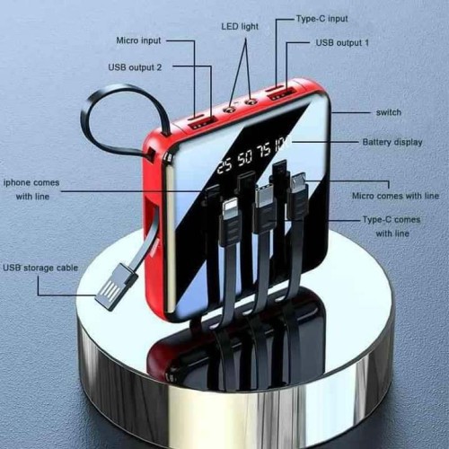 Description Model : Mini Portable Power Bank with Built-in Cable – 20000mAh (PB3) Material: ABS Plastic