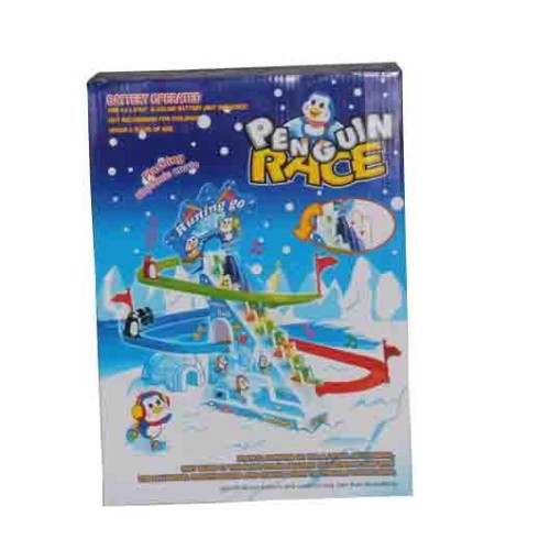 They climb up the slope on an amazing escalator in the time with the delightfulpenguin sound and sliding down the track as figure skier.
