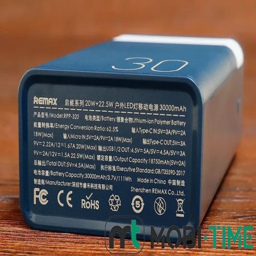 The Remax RPP-320 Power Bank is a powerful and reliable solution for charging your devices safely. With an impressive capacity of 30,000 mAh, it meets the needs of the most demanding users, while offering fast and efficient charging thanks to its advanced technologies such as QuickCharge 22.5W and USB Power Delivery 20W.