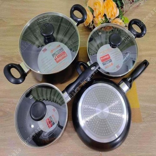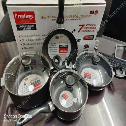 ✓ পণ্যের নাম : Prestige Omega Granite (Set of 7 Pieces with Sos Pan, korai, fry pan, milk pan ) Induction Bottom Cookware Set (Aluminium, 7 - Piece) ✓ সারাদেশে হোম ডেলিভারির সুবিধা। ✓ পণ্য হাতে পাওয়ার পর মুল্য পরিশোধ করুন। ✓ পণ্যের বিবরণ : Color: Black Dishwasher Safe With Induction Bottom Non-stick Coated marbel coating size-Sos pan= 24cm, fry pan=24cm, korai=22cm, milk pan =18cm