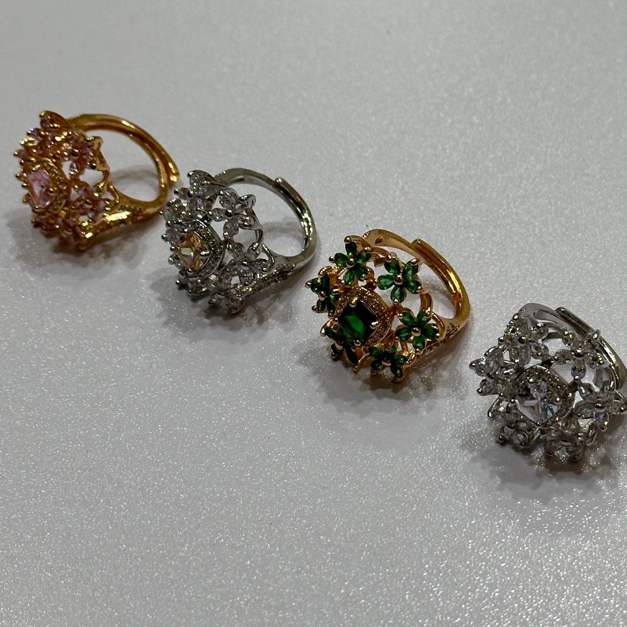 এই গর্জিয়াস রিংগুলো তৈরি হয়েছে ইউনিক ফ্লোরাল ডিজাইনে, মাঝখানে দেওয়া হয়েছে কালারফুল স্টোন যা রিংয়ের সৌন্দর্য আরও বহুগুণ বাড়িয়ে দিয়েছে। পার্টি বা গিফট দেওয়ার জন্য একদম পারফেক্ট পছন্দ!
