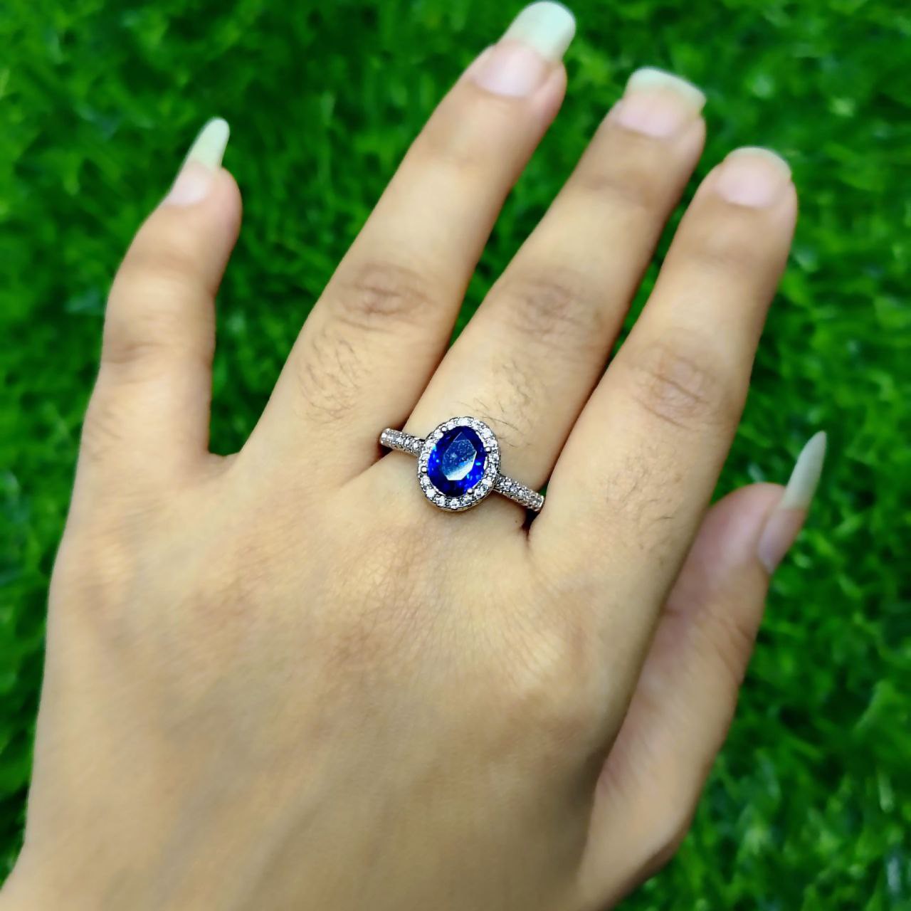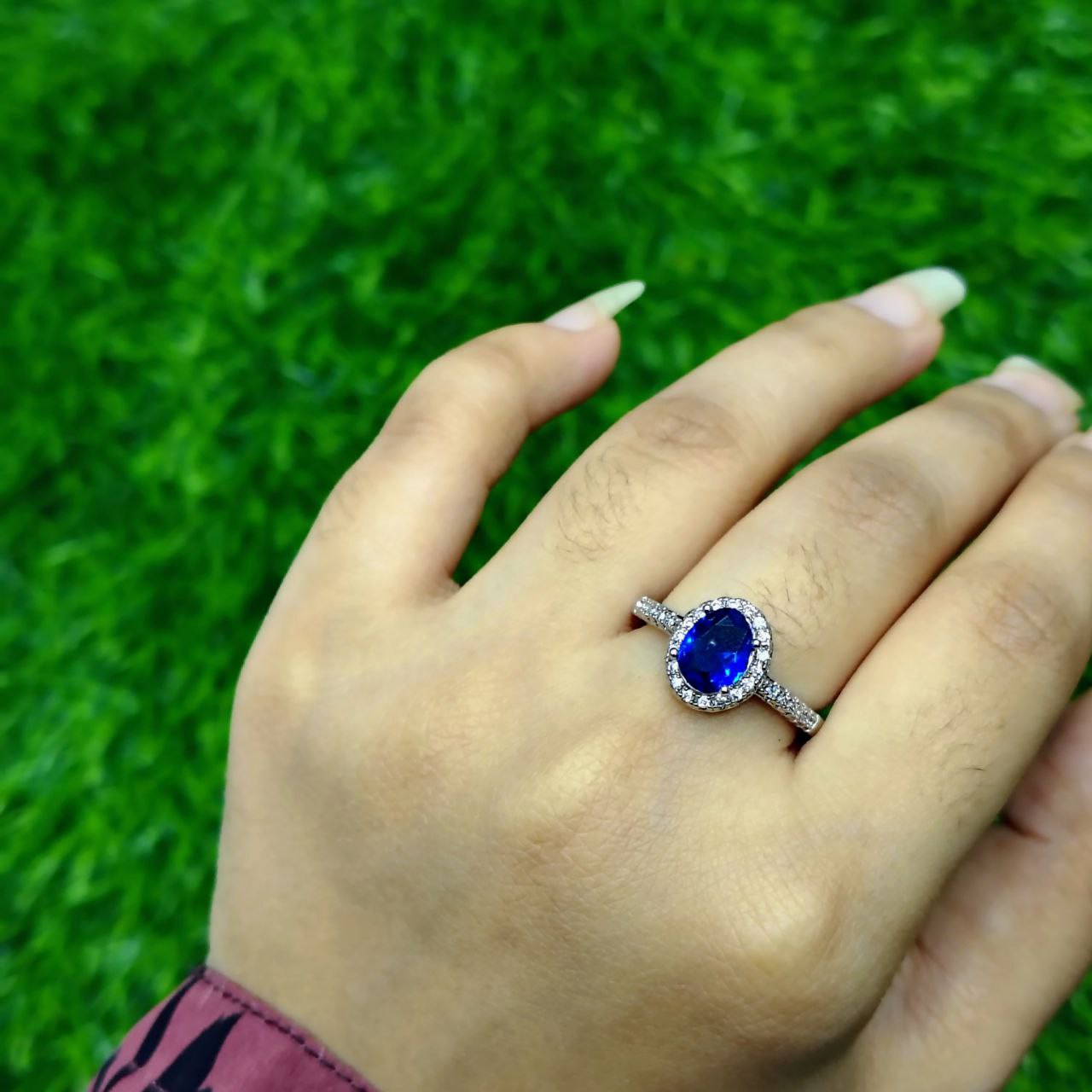 A beautifully crafted ring featuring a dazzling teardrop-shaped royal blue stone, surrounded by shimmering clear stones on a polished silver-tone band. Perfect for adding a touch of luxury to any outfit, whether it's a formal event or everyday elegance.