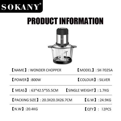 SOKANY SK-7025A 800W Wonder Chopper with Multifunction for Chopping and Grinding