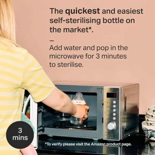 New self-sterilising: Our baby bottles can now be self-sterilised, killing viruses and 99.9 Percent of bacteria***. Simply fill with 50ml of water, replace the teat and cap and heat in the microwave for 3 minutes