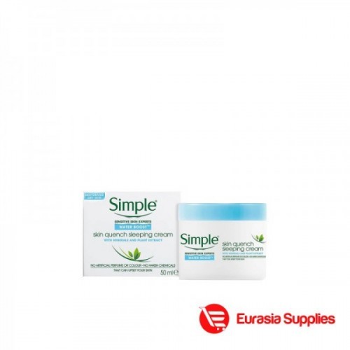 Simple Water Boost Skin Quench Sleeping Cream transforms dull and tired skin, replenishing dehydrated skin while you sleep! It works naturally with skin, for instant and continuous hydration throughout the day. This silky, lightweight moisturizer is made with a plant extract and skin-essential minerals. With regular use, it boosts skins natural hydration process, for health-looking skin. Specially formulated for dehydrated, dry skin, Simple Water Boost Skin Quench Sleeping Cream contains no harsh chemicals, artificial colors, dyes, or perfume, making it perfectly suitable for even sensitive skin.As part of your skincare routine try our new Simple Water Boost skincare range, dedicated to reversing the 5 early symptoms of dehydration: dryness, roughness, feelings of tightness, dullness and dry dehydration lines; to leave skin revitalized, supple and dewy fresh. At night, after cleansing with a Simple Water Boost cleanser, we recommend applying Simple Water Boost Hydrating Booster all over your face to instantly moisturize your skin and help it stay hydrated for longer. Finish your hydration skincare routine with our Simple Skin Quench Sleeping Cream.