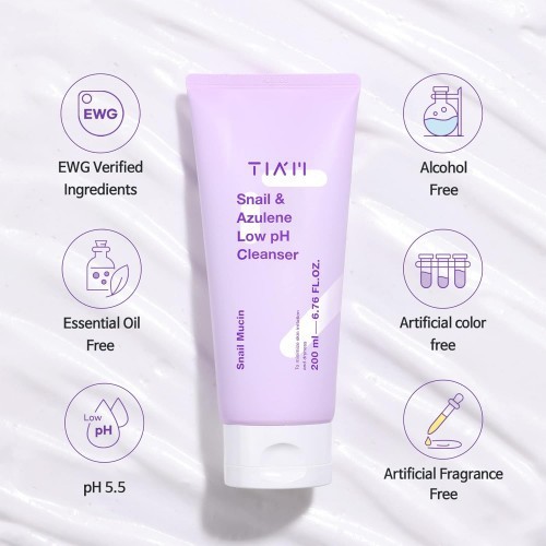 Tiam Snail & Azulene Low pH Cleanser is a gentle, low-pH facial cleanser that is designed to remove dirt, makeup, and impurities from the skin while also soothing and hydrating it. The cleanser contains a blend of snail mucin and azulene, which work together to promote skin health and hydration.Snail mucin is a popular ingredient in Korean skincare products and is known for its ability to help improve skin texture, reduce the appearance of fine lines and wrinkles, and hydrate the skin. Azulene is derived from chamomile and is known for its anti-inflammatory and soothing properties, making it a great ingredient for sensitive skin. the cleanser has a gel-like texture that lathers into a soft foam, making it easy to apply and rinse off. The low pH formula helps to maintain the skin’s natural balance and protect the skin barrier. The Tiam Snail & Azulene Low pH Cleanser is suitable for all skin types, but especially for those with dry or sensitive skin.