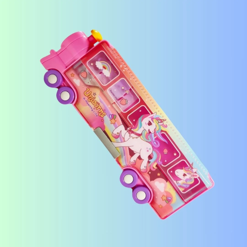 Toyshine Double Compartment Bus Pencil Box With Moving Tyres, Button Enabled Storage and Sharper For Kids
