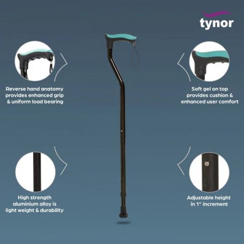 Tynor Walking Stick is a general purpose walking aid, which can be used by geriatric, weak patients, or can be used as post-operative rehabilitation aid. Height adjustment feature ensures proper load bearing, comfort and correct posture. Available in silver and black color.