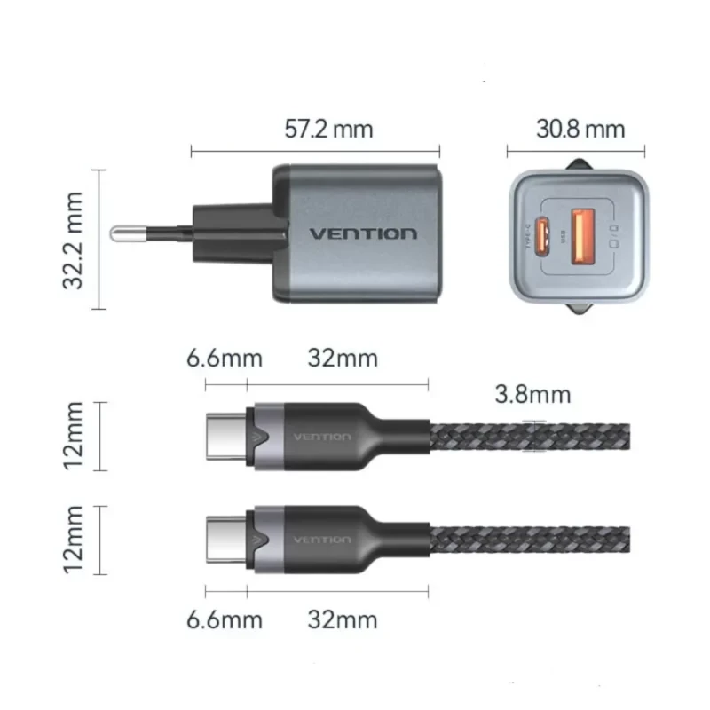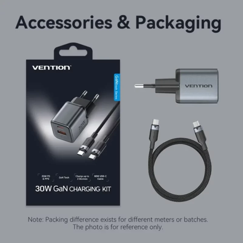 Vention 2-Port GaN Charger 30W USB-C + 18W USB-A, EU Plug with 1M USB-C Cable